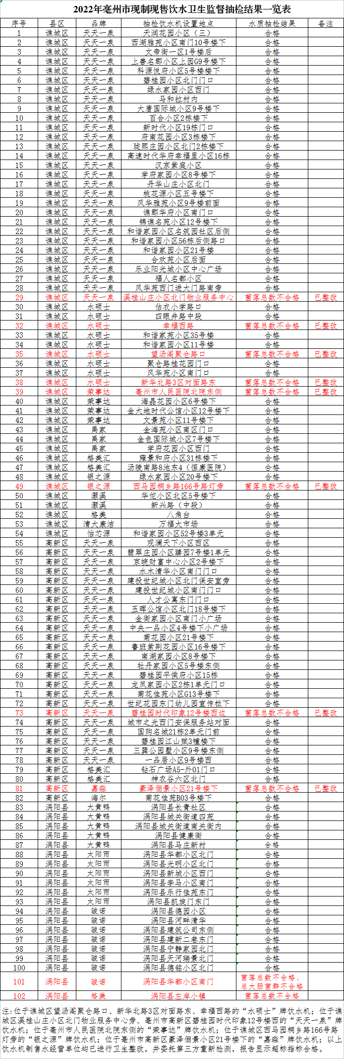 102台现制现售饮水机中,92台现制现售饮水机制售的水质合格,10台现制现售饮水机制售的水质有11个指标不合格。其中位于涡阳县华都小区南门的1台“骏诺”牌现制现售饮水机制售的水质总大肠菌群超标;10台现制现售饮水机制售的水质菌落总数超标,它们分别是: