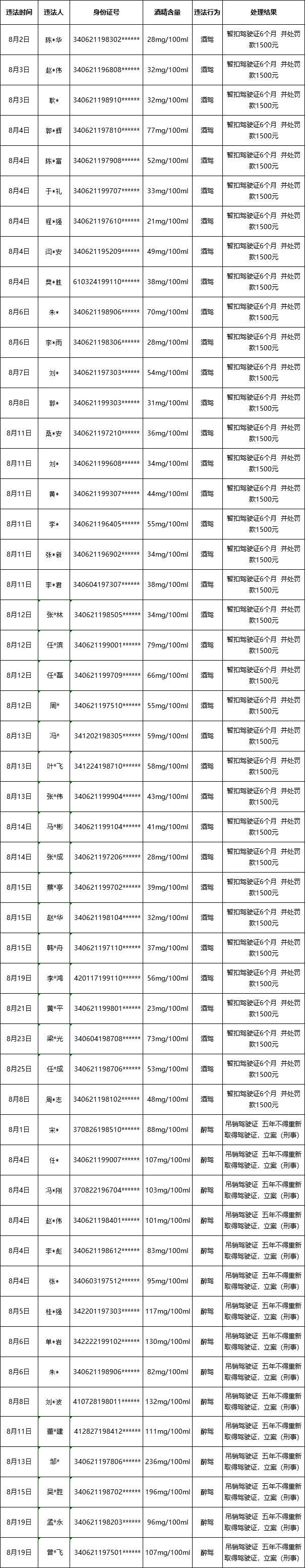 濉溪警方公布8月份“酒司机”名单 多人被立案 分享到: 发布时间:2023-09-03 15:30 濉溪警方微信号 据濉溪警方微信号9月3日消息,今天,濉溪警方对8月份酒驾醉驾人员进行曝光。一起来看看,又有哪些“酒司机”上榜了。 相关阅读 路遇检查急停草丛 六安警方查获一起醉酒驾驶案 临近开学季,为了强化校园周边道路交通安全管理,保障校园周边环境安全,霍邱县公安局王截流派出所持续开展夏夜治安巡查宣防行动。大皖新闻记者8月31日了解到,在行动中,民警意外查获一起醉酒驾驶案件。 六安一男子参加“211”升学宴 随后酒驾吹出“211” 涉嫌醉驾被刑事立案 六安一名男子8月12日晚上参加了考上“211”大学的亲戚家孩子的升学宴,酒后驾驶摩托车回家,结果半路上遇到交警在例行稽查酒驾,现场吹出了“211”数字。 “211,80就属于醉驾了,你是211(毫克)。”民警表示。 该... 登录 评论一下 评论 0人参与,0条评论 还没有评论,快来抢沙发吧! 最热评论 最新评论 已有0人参与,点击查看更多精彩评论 请输入验证码 × 确定 取消
