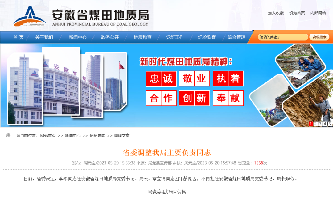 大皖新闻讯 据安徽省煤田地质局官网5月20日消息,日前,安徽省委决定,李军同志任安徽省煤田地质局党委书记、局长。章立清同志因年龄原因,不再担任安徽省煤田地质局党委书记、局长职务。