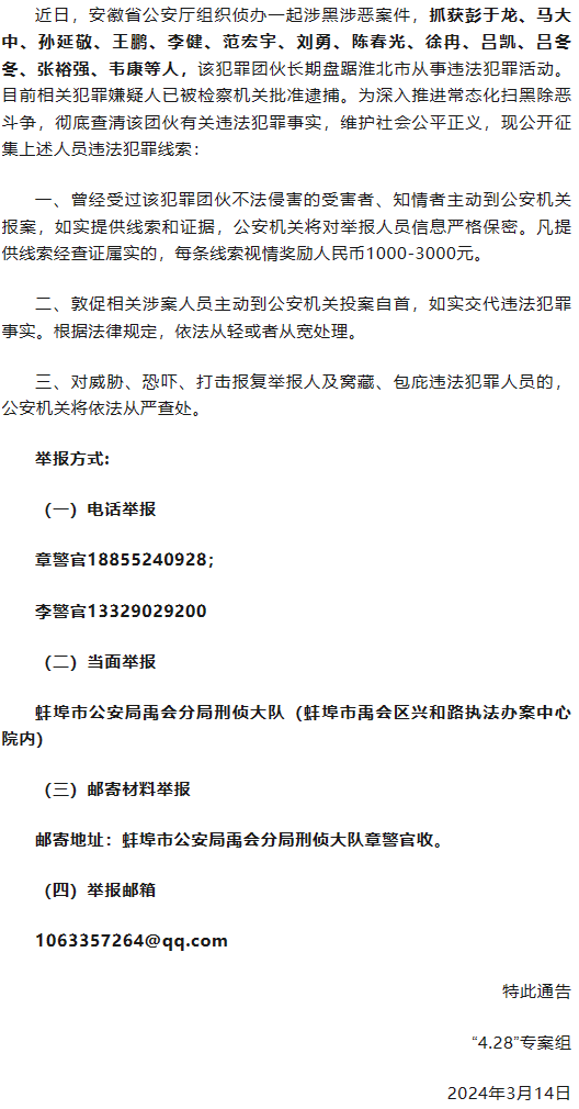 大皖新闻讯 据淮北公安消息,3月14日,“4.28”专案组发布关于公开征集彭于龙、马大中、王鹏、孙延敬等人违法犯罪线索的通告。
