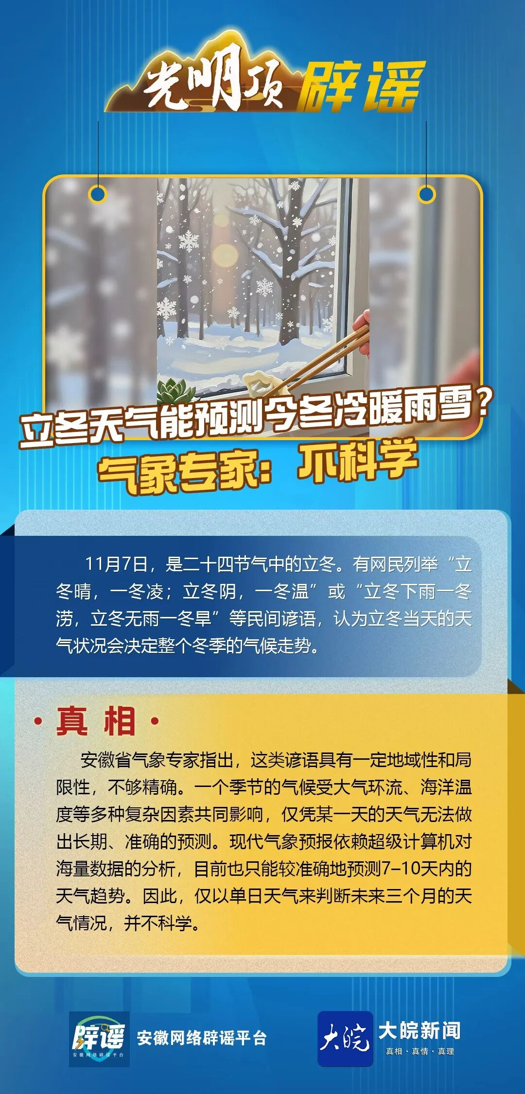 大皖新闻讯 随着立冬节气到来,关于今冬天气情况如何也备受关注。记者注意到,在一些社交媒体上,有一些基于立冬当天的天气可以预测今冬天气情况的论调引发不少关注。