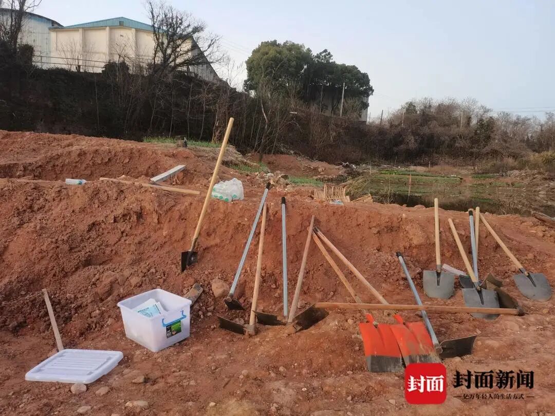 在工地上,记者看到现场遗留着十几把铁锹、镢头等勘测工具,以及警戒线等物证提取所需的物品。