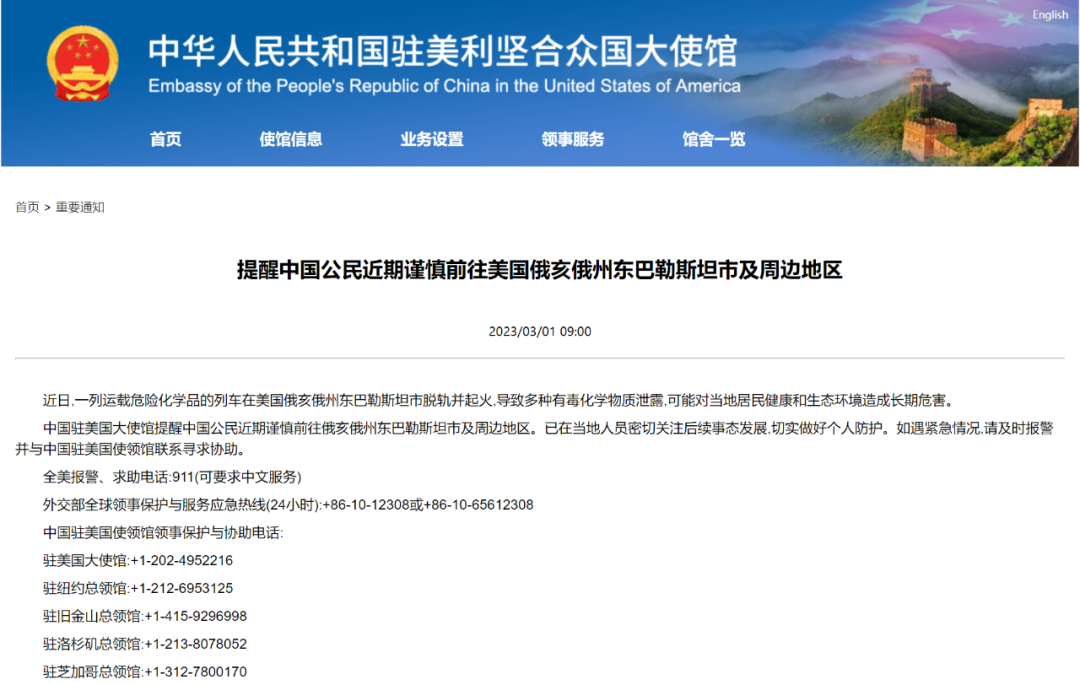 中国驻美国大使馆提醒中国公民近期谨慎前往俄亥俄州东巴勒斯坦市及周边地区。已在当地人员密切关注后续事态发展,切实做好个人防护。如遇紧急情况,请及时报警并与中国驻美国使领馆联系寻求协助。
