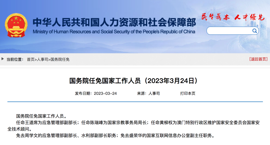 免去周学文的应急管理部副部长、水利部副部长职务;免去盛荣华的国家互联网信息办公室副主任职务。