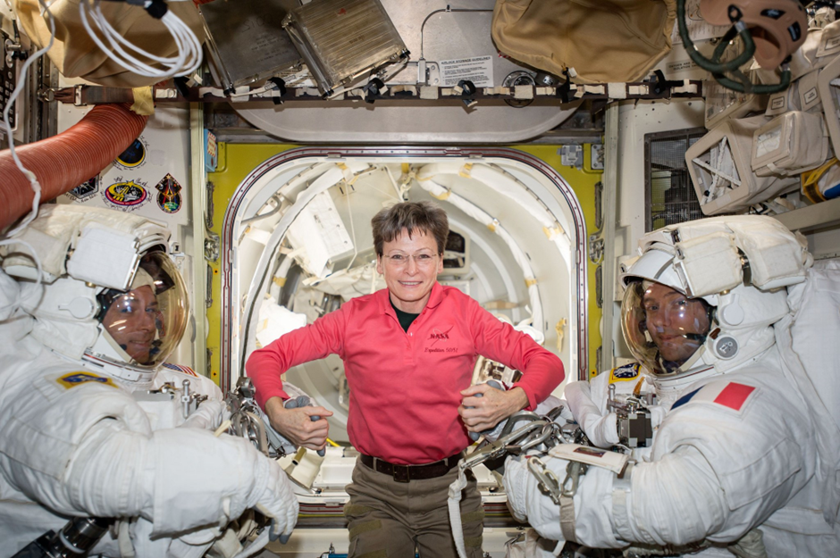 △NASA的著名航天员Peggy Whitson在国际空间站时就时常戴着眼镜,她身边执行出舱作业的航天员本质上也“戴着眼镜”。