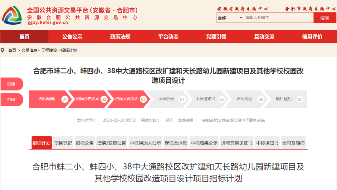 大皖新闻讯 据合肥市人民政府发布公众号消息 为方便孩子就近上学、上好学,合肥市将对部分学校进行改扩建。按照日前合肥公共资源交易中心发布的招标公告显示,此次项目涉及学校包括合肥市蚌二小、蚌四小、38中大通路校区以及天长路幼儿园。