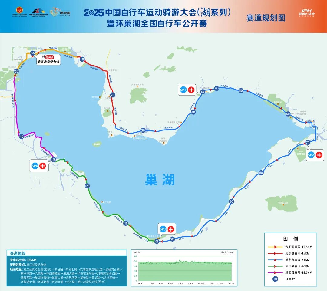 2025中国自行车运动骑游大会暨环巢湖全国公路自行车公开赛将于5月11日(周日)在合肥市举办,比赛线路为:渡江战役纪念馆(起点)→云谷路→环湖北路→蔡永祥路→滨湖大道→健康西路→体育大道→东风西路→湖光路→亚父路→G346国道→环巢湖大道→环湖北路→包河大道→云谷路→渡江战役纪念馆(终点),赛道覆盖包河区、肥东县、巢湖市、庐江县、肥西县五个县(市)区,沿环巢湖一圈,全程156公里,07:30鸣枪开赛,比赛时间约6小时30分。