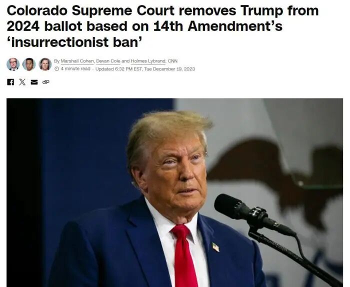 综合美媒报道,美国科罗拉多州最高法院当地时间19日裁定,根据美国宪法第14修正案,鉴于美国国会骚乱事件,将共和党籍前总统特朗普从该州2024年总统初选的投票中除名,认为他没有资格竞选美国总统。
