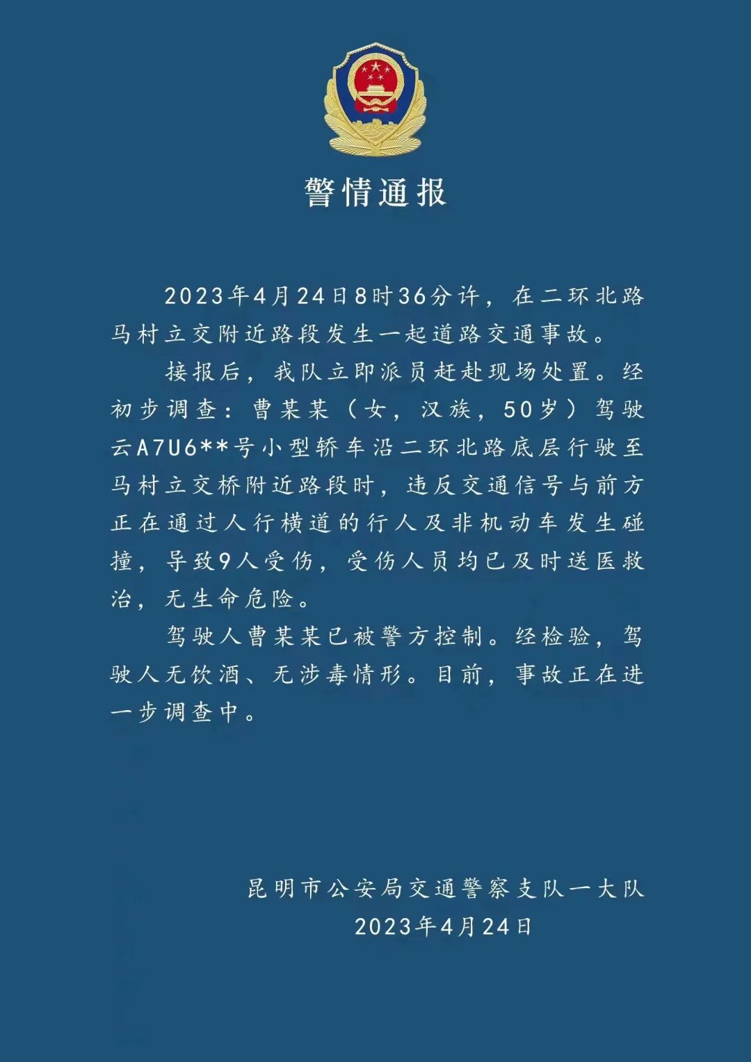 接报后,该队立即派员赶赴现场处置。经初步调查:曹某某(女,汉族,50岁)驾驶云A7U6**号小型轿车沿二环北路底层行驶至马村立交桥附近路段时,违反交通信号与前方正在通过人行横道的行人及非机动车发生碰撞,导致9人受伤,受伤人员均已及时送医救治,无生命危险。