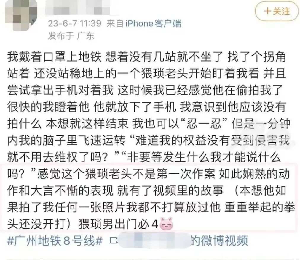 随后,该女子在网络曝光大叔是猥琐男,称其手法娴熟不是第一次作案,并表示既然没有偷拍,那他为什么不为自己发声。博文发布之后获得众多网友支持点赞,也有不少网友发文替大叔鸣不平。