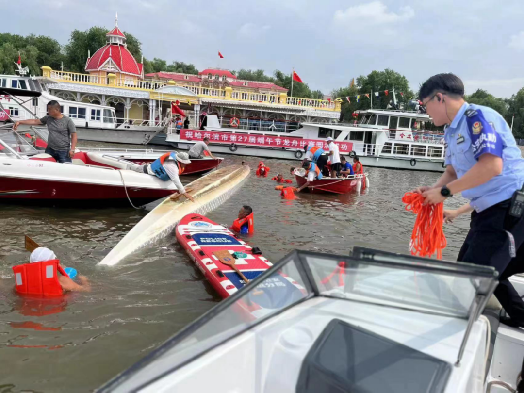 14时20分许,航运分局水上巡逻警力与社会救援力量联合开展巡逻,当巡逻至道里区体育码头附近水域时,发现一艘载着10人的龙舟在训练过程中倾覆、人员全部落水。航运分局巡逻警力迅速反应,立即启动水上救援应急预案,并采取抛投救生绳、动用救生浆板等救援方式,科学处置多人落水情况,经过近5分钟的高效救援,将10名落水群众成功营救上岸。