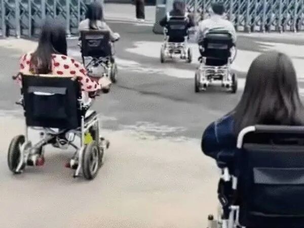 视频中,年轻人操控着电动轮椅,成群结队地穿梭于马路、景区、商场甚至写字楼间。