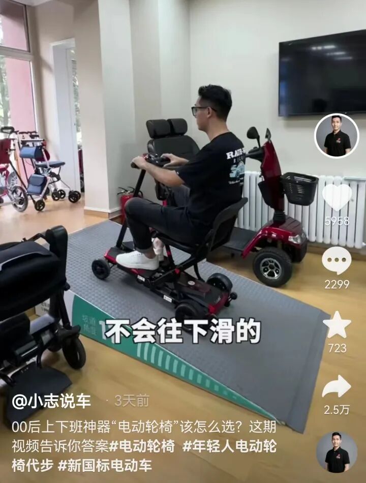 深耕老年人代步车领域的斯途康科技有限公司总经理郭信谊告诉记者,最近他确实也刷到很多电动轮椅出行的相关短视频,但就最近半个月来看,到店里咨询电动轮椅的人群依然以老年人为主,或者是年轻人买来给腿脚不便的家人使用,想买来通勤的客户很少。
