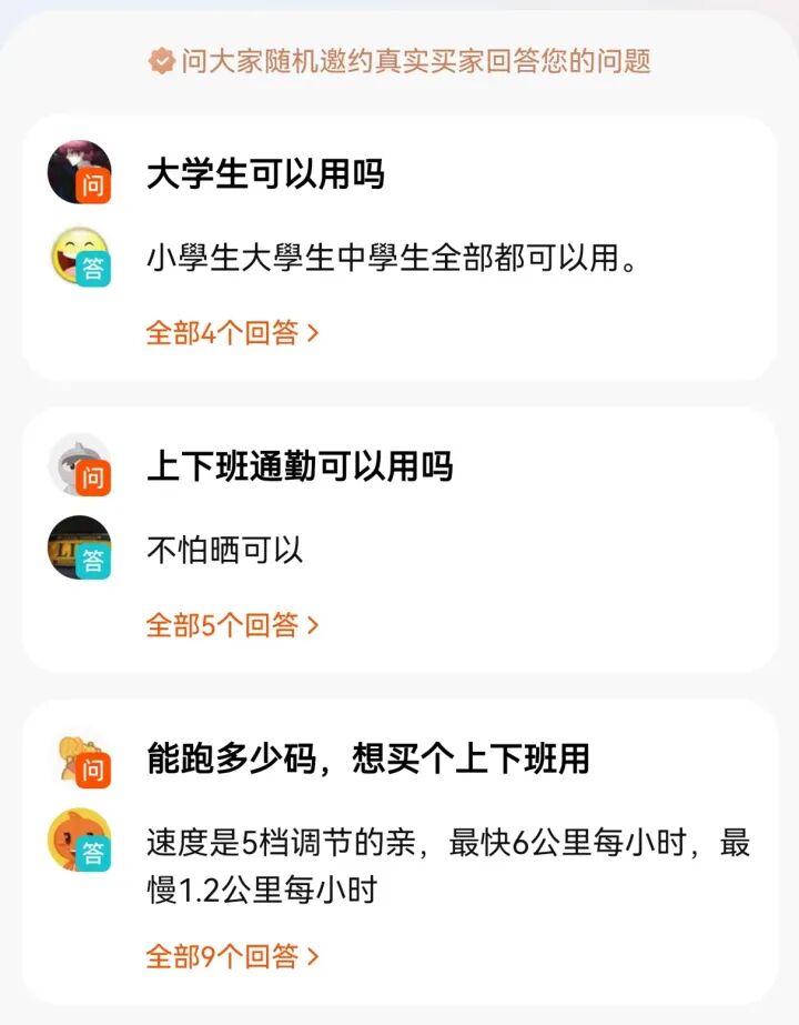 在产品主页,不少消费者抛出“大学生能用吗?”“上下班通勤可以使用吗?”这样的疑问。