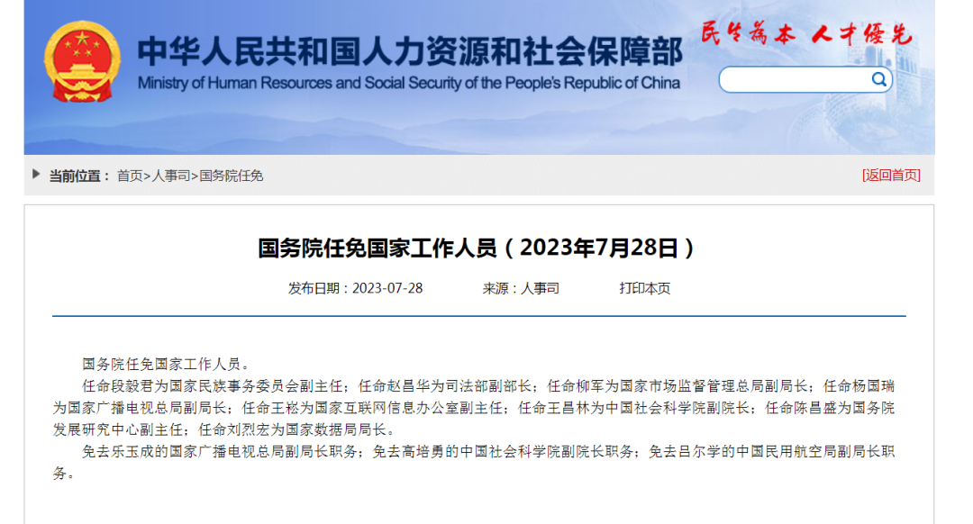 人社部网站7月28日消息,国务院任免国家工作人员。