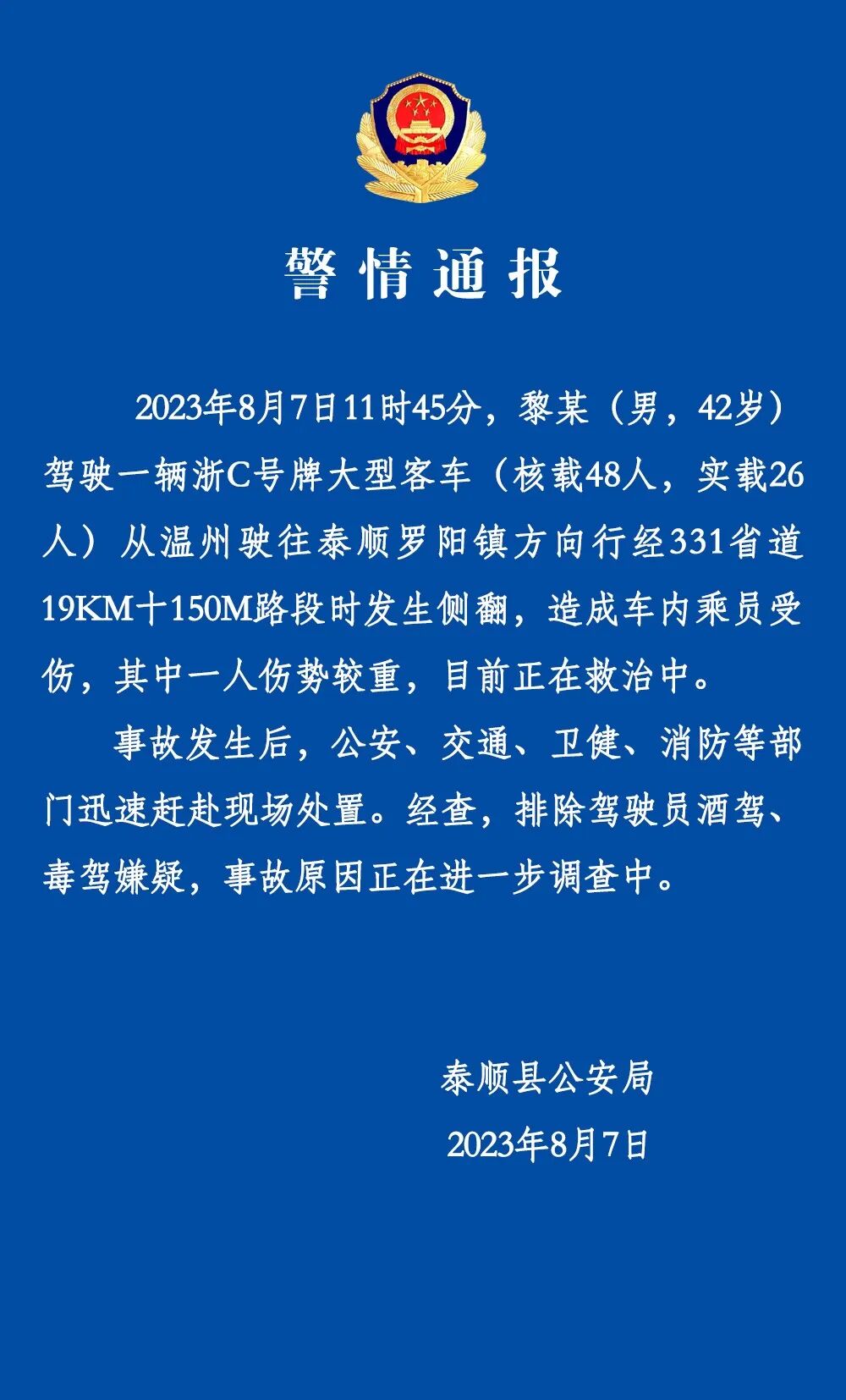 8月7日,浙江温州泰顺县“平安泰顺”微信公众号发布警情通报:2023年8月7日11时45分,黎某(男,42岁)驾驶一辆浙C号牌大型客车(核载48人,实载26人)从温州驶往泰顺罗阳镇方向行经331省道19KM+150M路段时发生侧翻,造成车内乘员受伤,其中一人伤势较重,目前正在救治中。