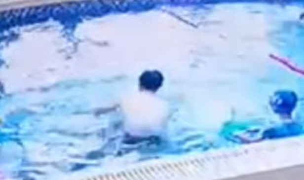 视频显示,游泳教练将一名幼童拉拽到身前,连续四次强行将其头摁到水里,幼童被呛水。
