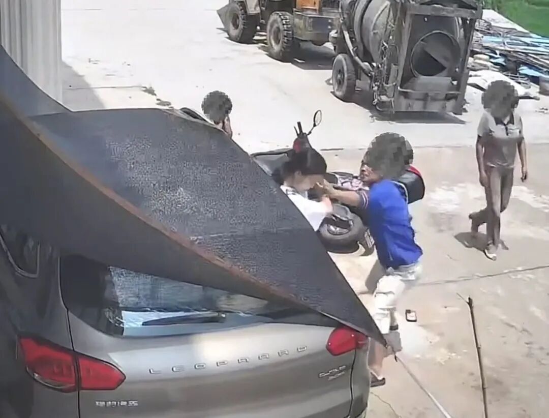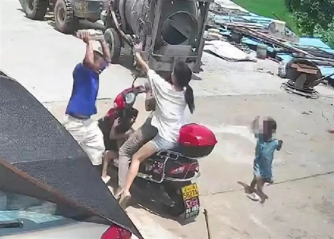 监控视频显示,一名中年妇女和一名年轻女子合骑一辆电动车,前方还坐着两个小孩。这时,一名身穿蓝衣的中年男子突然出现,手持异物径直砸向骑车的中年女子头部。