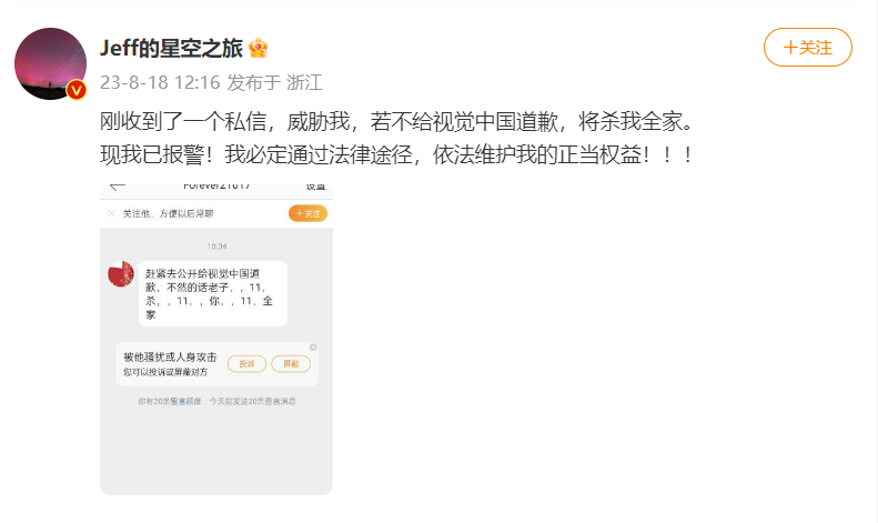 8月18日,科学科普博主、星空摄影师戴建峰发布微博称,自己收到了死亡威胁。私信称如果戴建峰不给视觉中国道歉,将杀掉他全家。