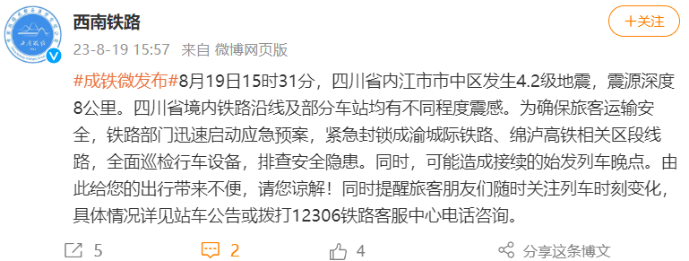 19日15时57分,西南铁路官方微博发布消息称,为确保旅客运输安全,紧急封锁成渝城际铁路、绵泸高铁相关区段线路,全面巡检行车设备,排查安全隐患。同时,可能造成接续的始发列车晚点。