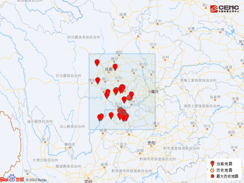 根据中国地震台网速报目录,震中周边200公里内近5年来发生3级以上地震共308次,最大地震分别是2021年9月16日在四川泸州市泸县发生的6.0级地震(距离本次震中61公里)和2019年6月17日在四川宜宾市长宁县发生的6.0级地震(距离本次震中138公里),按震级大小前50次历史地震分布如图。