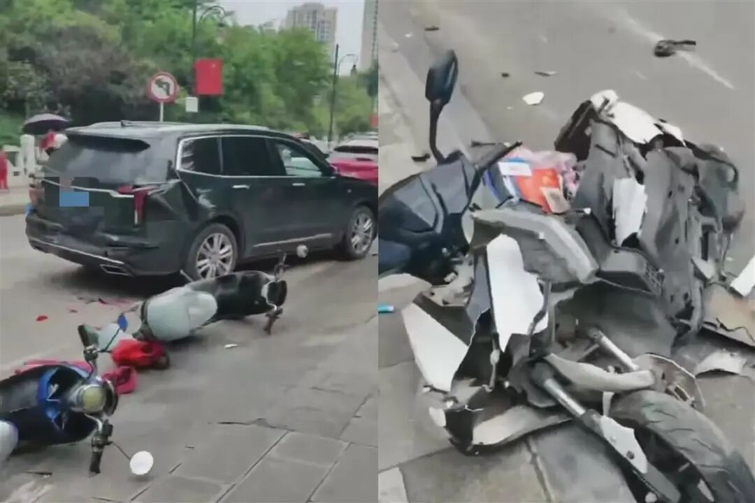 黑色车司机见状,连忙打方向盘试图拦截肇事车,但并未拦住。随后,肇事车撞到一排电动车后驶离现场,期间有人被撞倒在地,“肇事车离开时,车尾部还拖行着一辆电动自行车。”