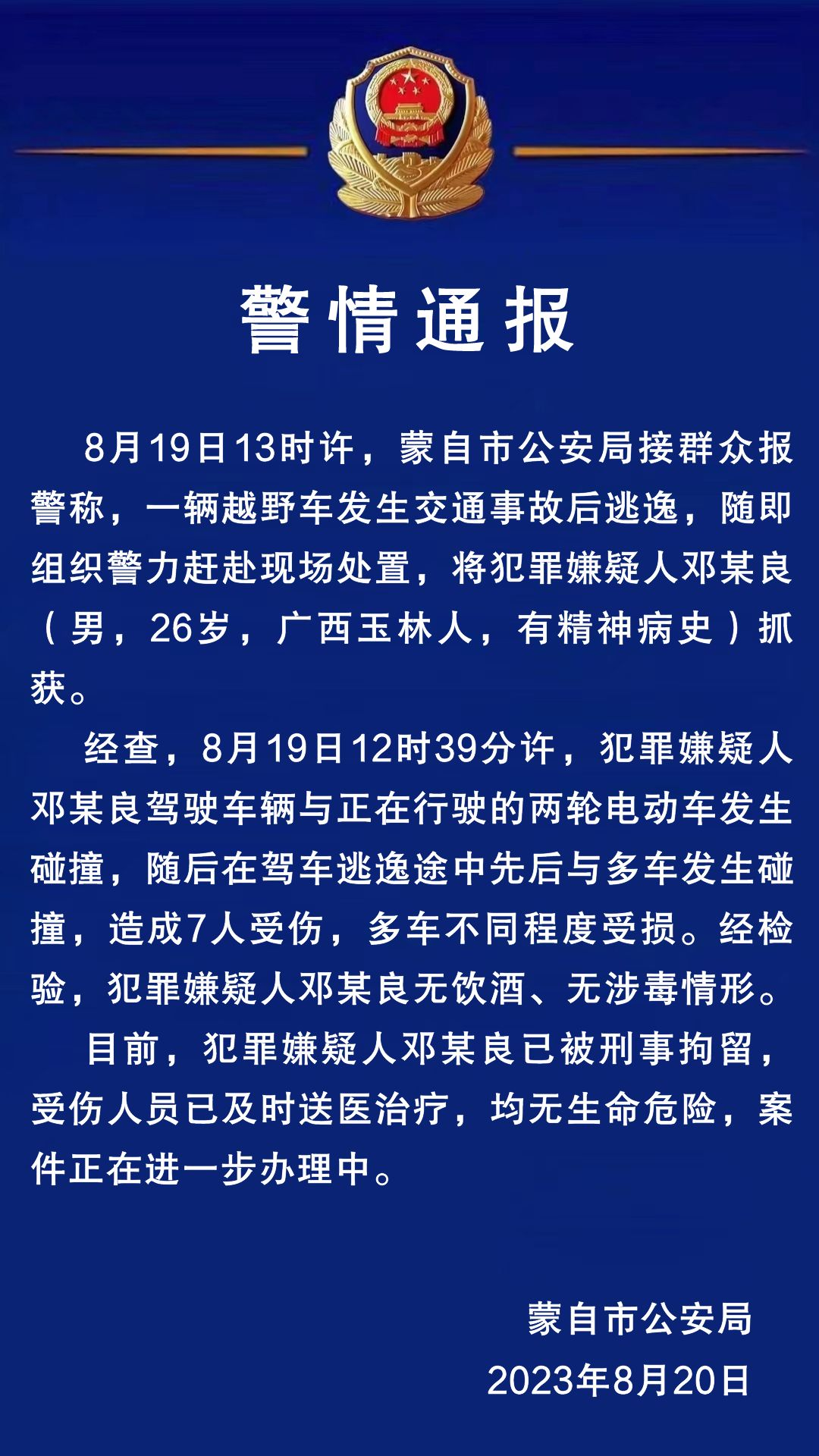 8月19日13时许,蒙自市公安局接群众报警称,一辆越野车发生交通事故后逃逸,随即组织警力赶赴现场处置,将犯罪嫌疑人邓某良(男,26岁,广西玉林人,有精神病史)抓获。