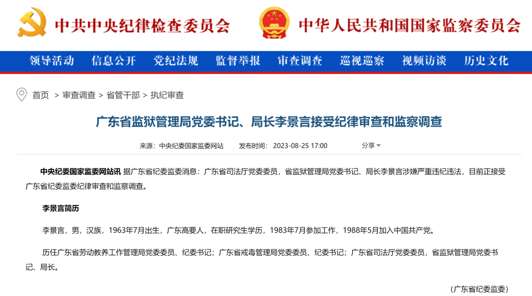 广东省司法厅党委委员,省监狱管理局党委书记、局长李景言涉嫌严重违纪违法,目前正接受广东省纪委监委纪律审查和监察调查。