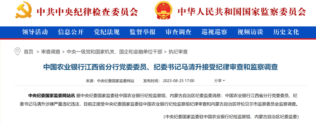 中国农业银行江西省分行党委委员、纪委书记马清升涉嫌严重违纪违法,目前正接受中央纪委国家监委驻中国农业银行纪检监察组纪律审查和内蒙古自治区呼伦贝尔市监察委员会监察调查。