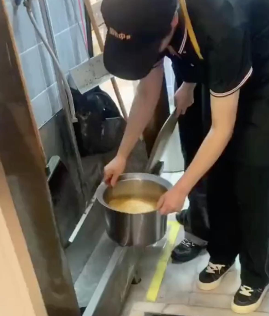 视频中,工作人员将大碗中的黄色饮品倒入水池,水池中有不少拖把、扫帚和垃圾。