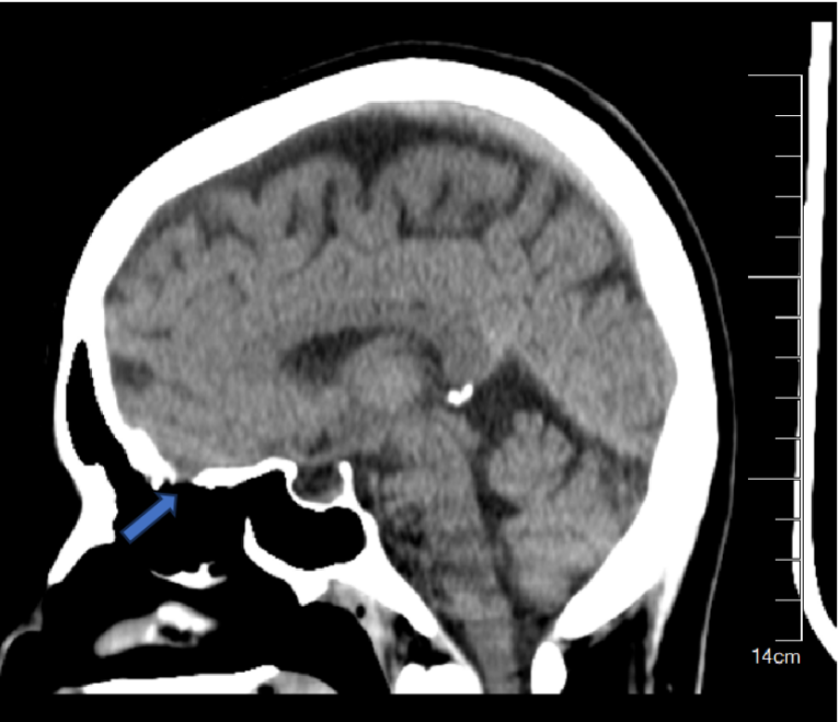 蓝色箭头所在位置就是脑脊液漏出之处