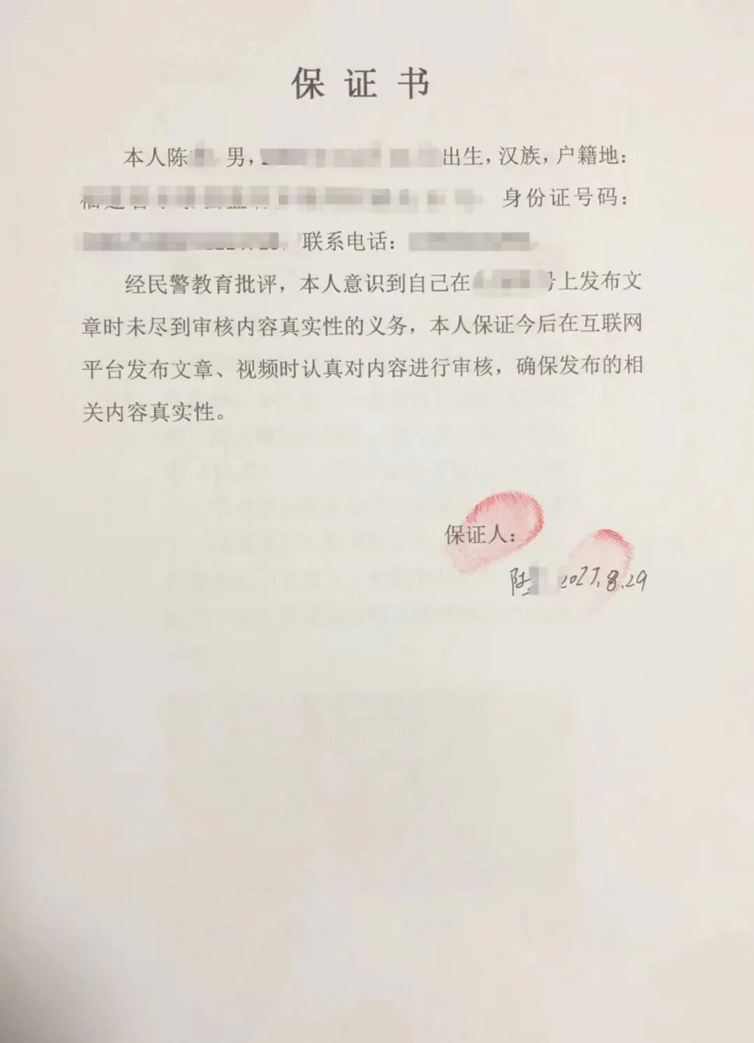 属地公安机关对陈某进行了批评教育,陈某认识到自身错误,及时将相关贴文删除,并写下保证书,承诺今后在在互联网平台发布文章、视频时,注意审核把关,确保发布内容的真实性。