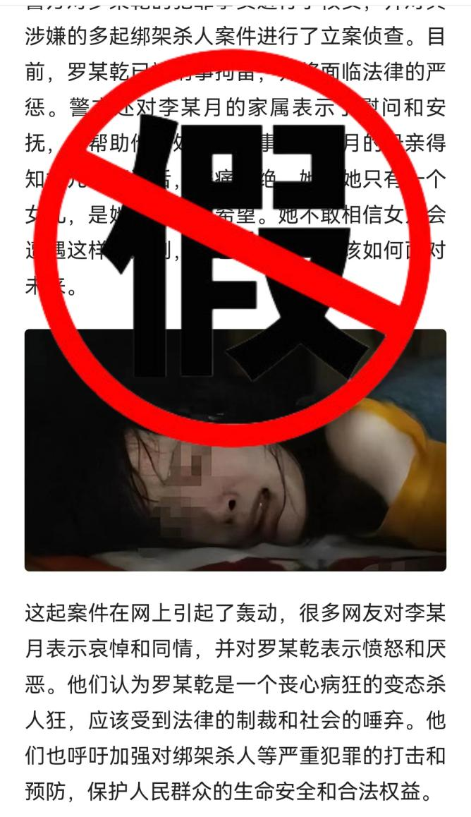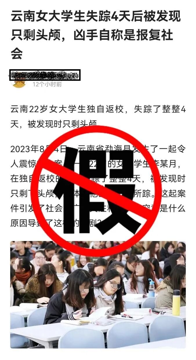 据“云南网警”消息,近期,西双版纳网警在工作中发现,一网民在某网络平台发布一篇题为“云南女大学生失踪4天后被发现只剩头颅,凶手自称是报复社会”的文章。文章内容称:“2023年8月4日,云南省勐海县发生了一起令人震惊的命案。一名22岁的女大学生李某月,在独自返校的途中失踪4天后遇害。”该文章发布后,引发广大网民热议和关注,造成不良社会影响。