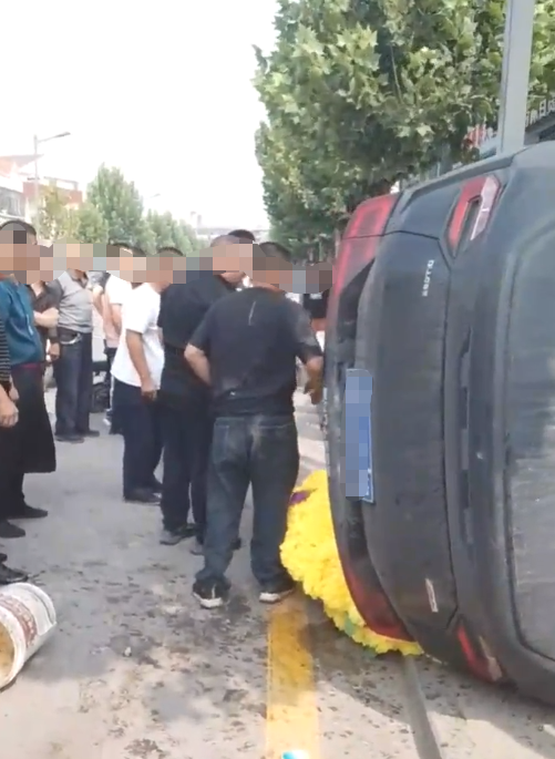 9月6日,山西晋中市太谷区一店铺门口,有一辆车撞人后侧翻在地,疑有伤亡。