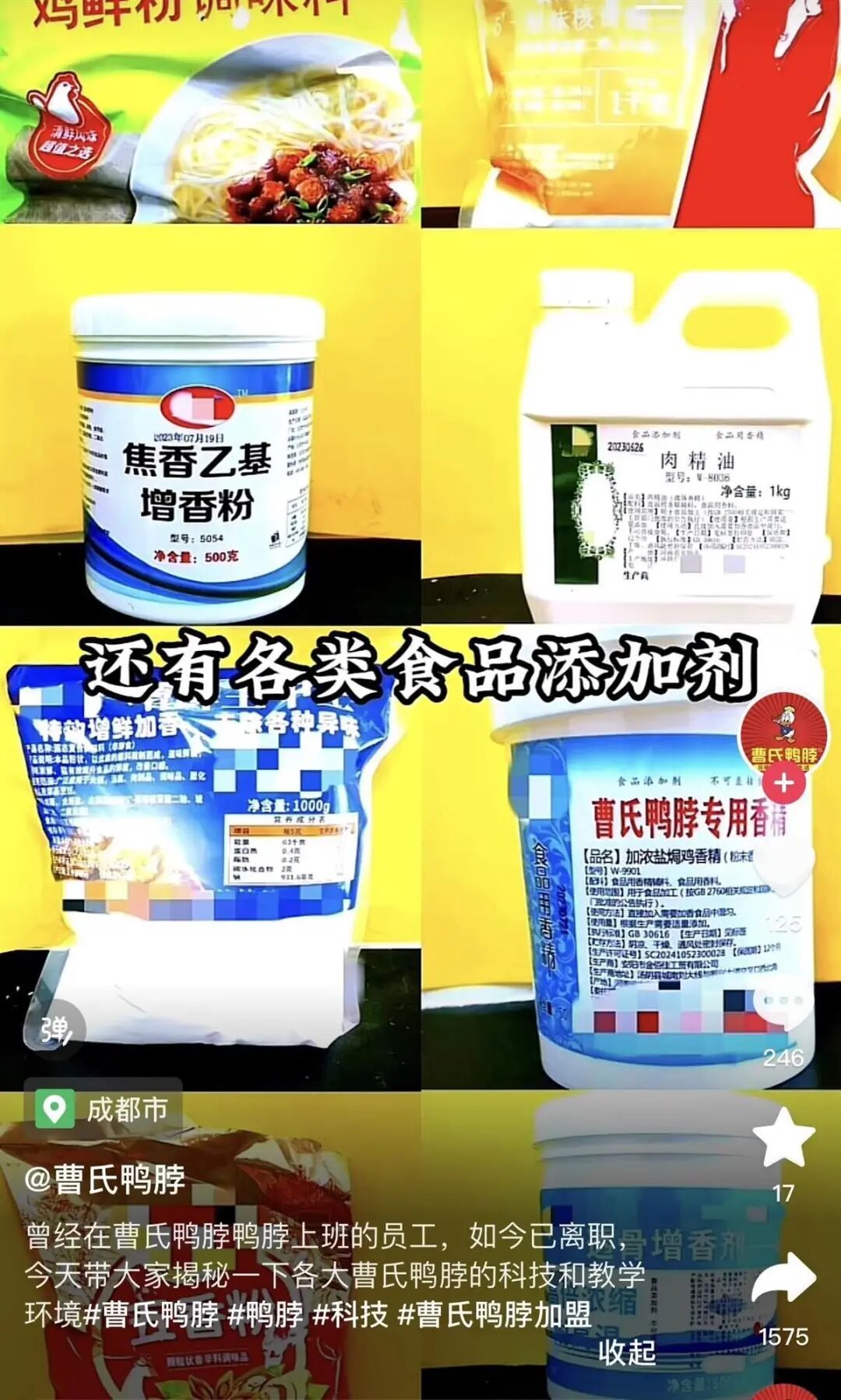 近日,一个名叫“曹氏鸭脖”的企业认证号发视频称,“我之前在曹氏鸭脖工作了一段时间,现在辞职了,给大家揭秘一下蜀湘曹氏鸭脖的黑科技,全是科技与狠活。”视频中曝光了汤料的配方,里面有十多种添加剂,像辣汤香精、辣椒红、油溶性辣椒精等都在其中,并注明了添加比例和使用方法。