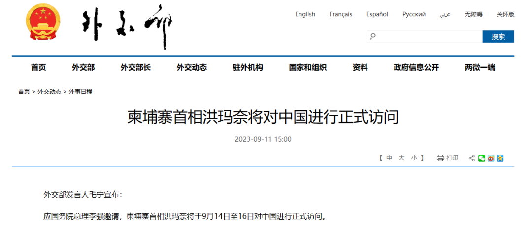 外交部宣布:他将访华! 发布时间:2023-09-11 15:38 来源:外交部 据外交部网站11日消息,外交部发言人毛宁宣布: 应国务院总理李强邀请,柬埔寨首相洪玛奈将于9月14日至16日对中国进行正式访问。 相关阅读 好评中国丨保护文化遗产 讲好中国故事 显微世界里探寻“纸寿千年”的奥秘 河南各地迎难而上全力抢收 多方聚力确保夏粮应收尽收 习近平的文化足迹丨从千年三苏祠感悟文化自信 习近平在内蒙古巴彦淖尔考察并主持召开加强荒漠化综合防治和推进“三北”等重点生态工程建设座谈会 登录 评论一下 评论 0人参与,0条评论 还没有评论,快来抢沙发吧! 最热评论 最新评论 已有0人参与,点击查看更多精彩评论 请输入验证码 × 确定 取消