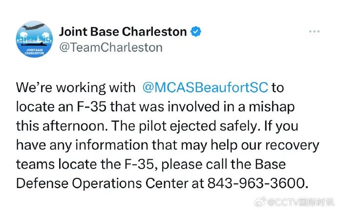 据@CCTV国际时讯消息 据美国军方证实,当地时间9月17日下午,在美国南卡罗来纳州北查尔斯顿地区,美国海军陆战队一架F-35B“闪电Ⅱ”型战机因“发生事故”坠毁。