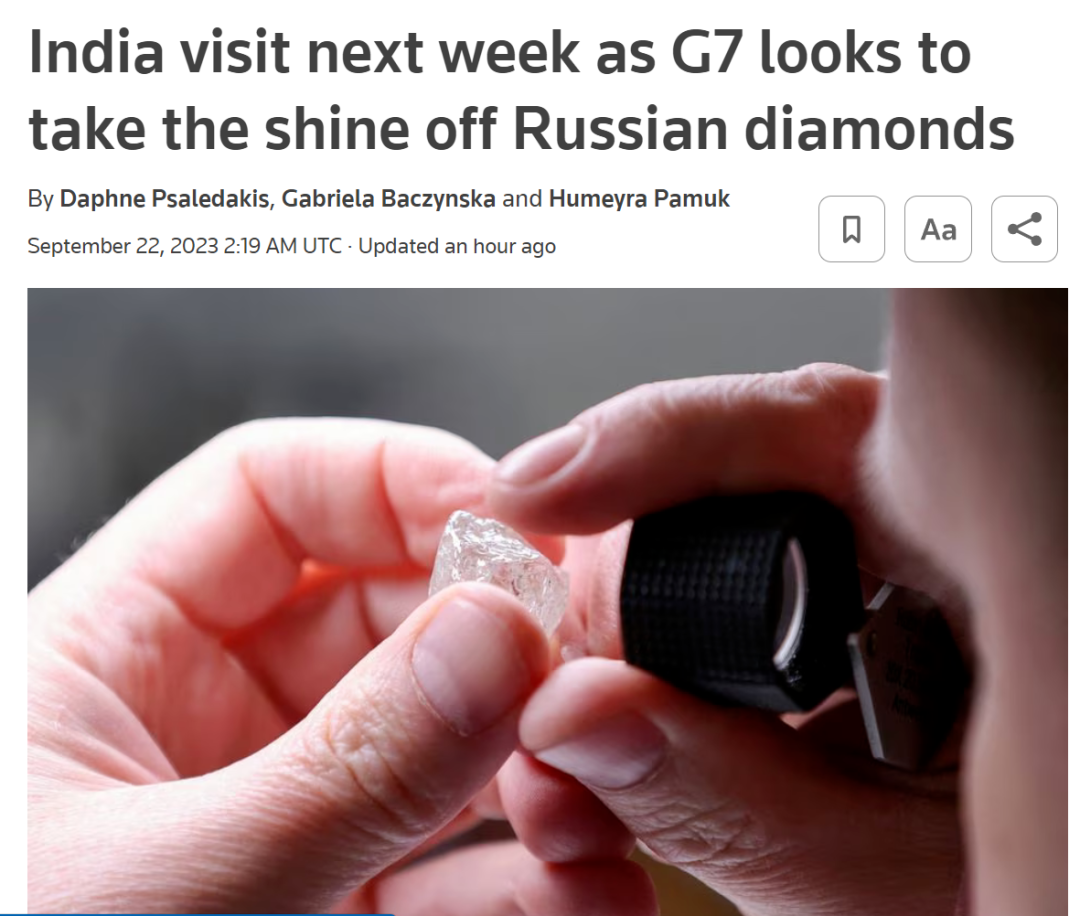 据环球时报报道 据路透社9月22日报道,拜登政府的两名官员表示,西方国家正派遣代表前往印度,讨论七国集团(G7)限制俄罗斯钻石出口可能带来的影响。报道称,印度目前拥有全球90%的稀有宝石的切割和抛光业务。