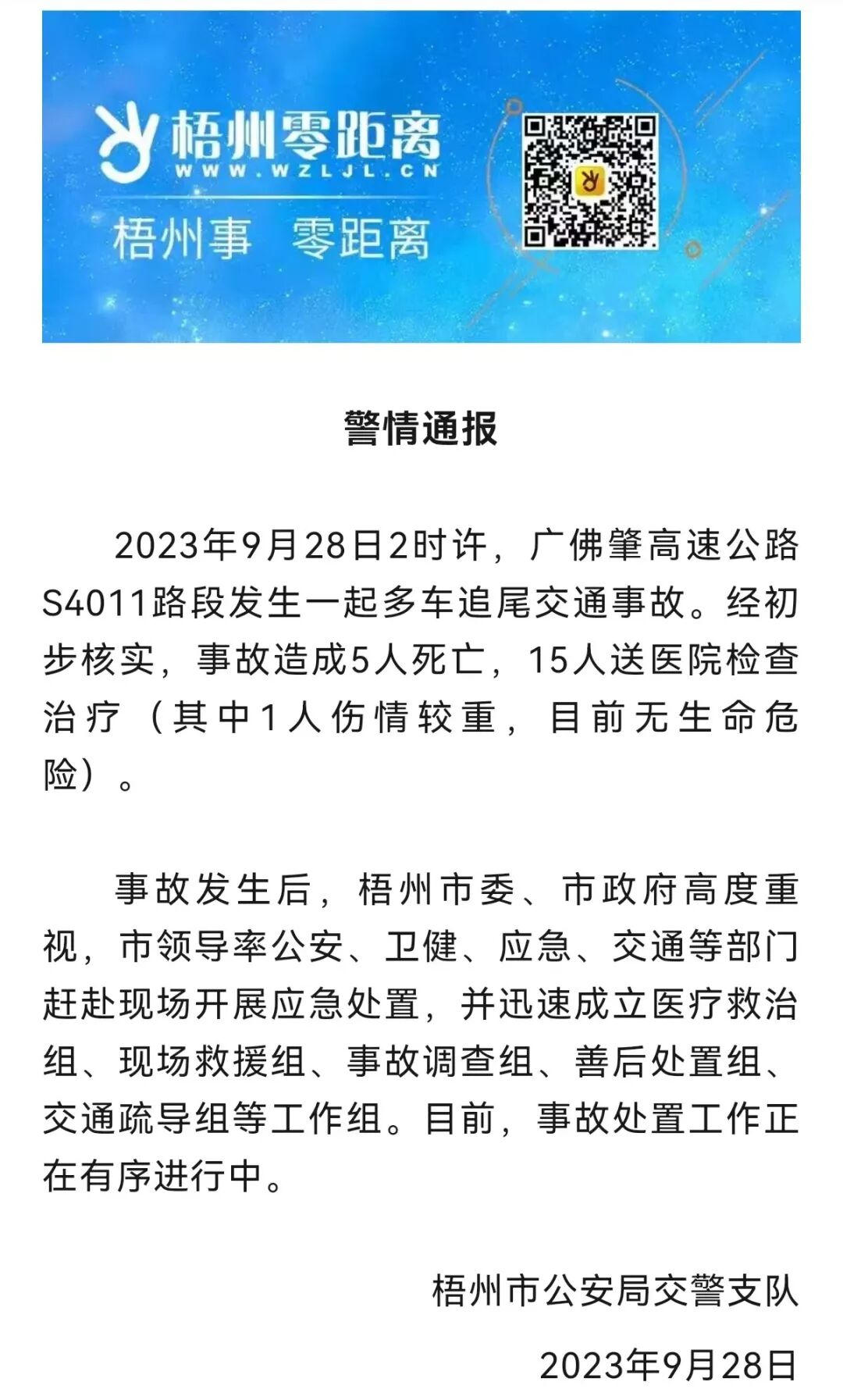 事故发生后,梧州市委、市政府高度重视,市领导率公安、卫健、应急、交通等部门赶赴现场开展应急处置,并迅速成立医疗救治组、现场救援组、事故调查组、善后处置组、交通疏导组等工作组。目前,事故处置工作正在有序进行中。