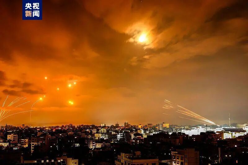 当地时间10月8日凌晨,以色列“铁穹”防御系统拦截巴勒斯坦武装分子发射的火箭弹。图源:央视新闻