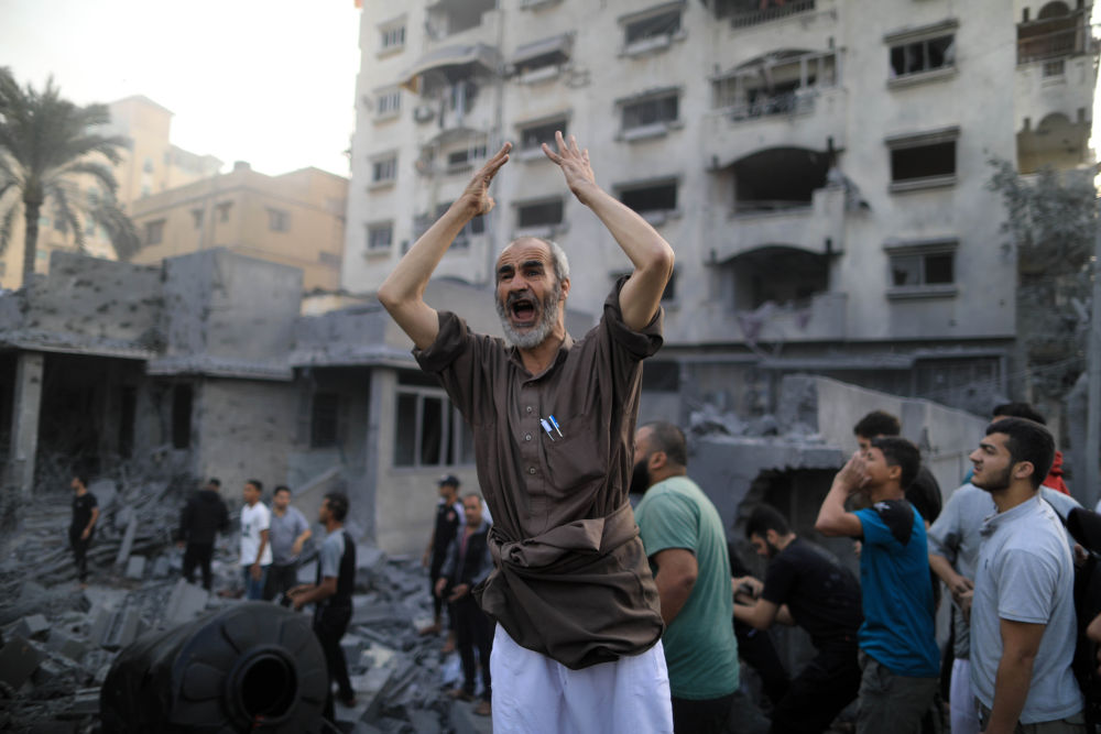 10月14日,在加沙地带南部城市汗尤尼斯,人们在遭以色列空袭炸毁的建筑中救援。新华社发(亚西尔·库迪摄)