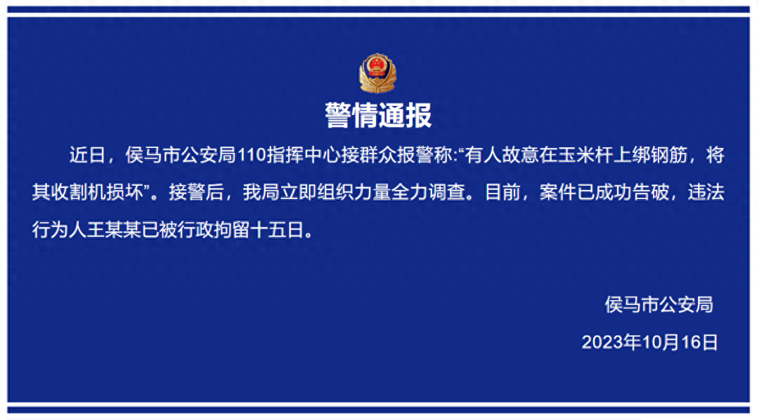 近日,侯马市公安局110指挥中心接群众报警称:“有人故意在玉米杆上绑钢筋,将其收割机损坏”。接警后,该局立即组织力量全力调查。目前,案件已成功告破,违法行为人王某某已被行政拘留十五日。
