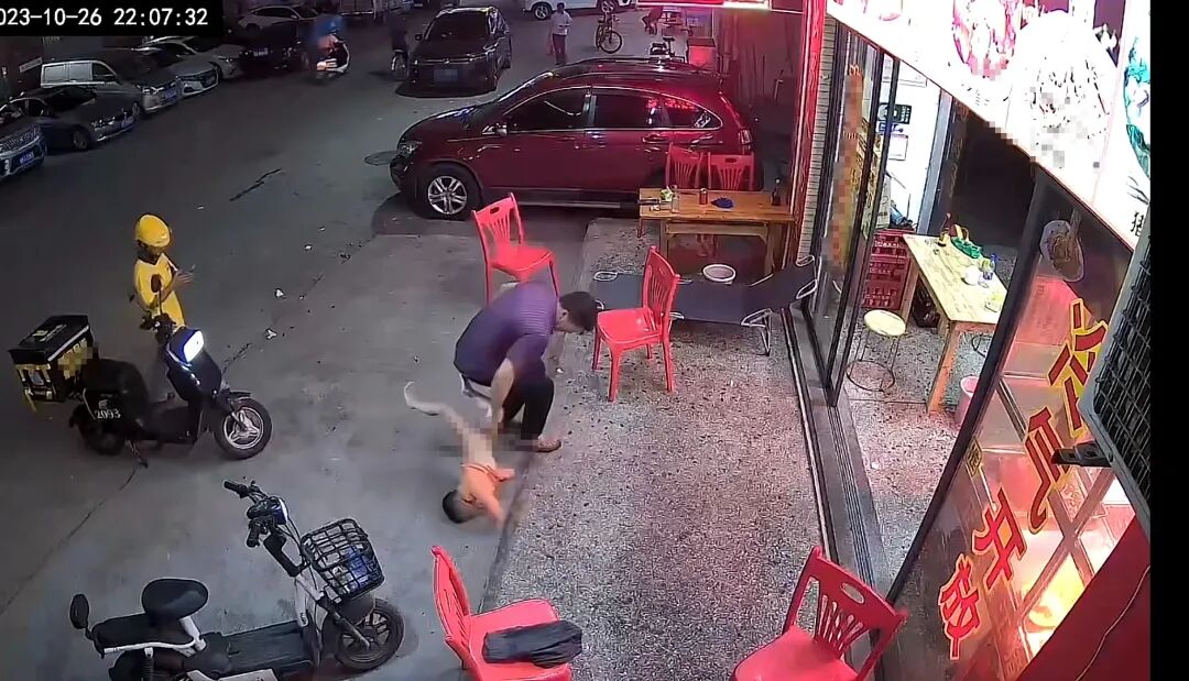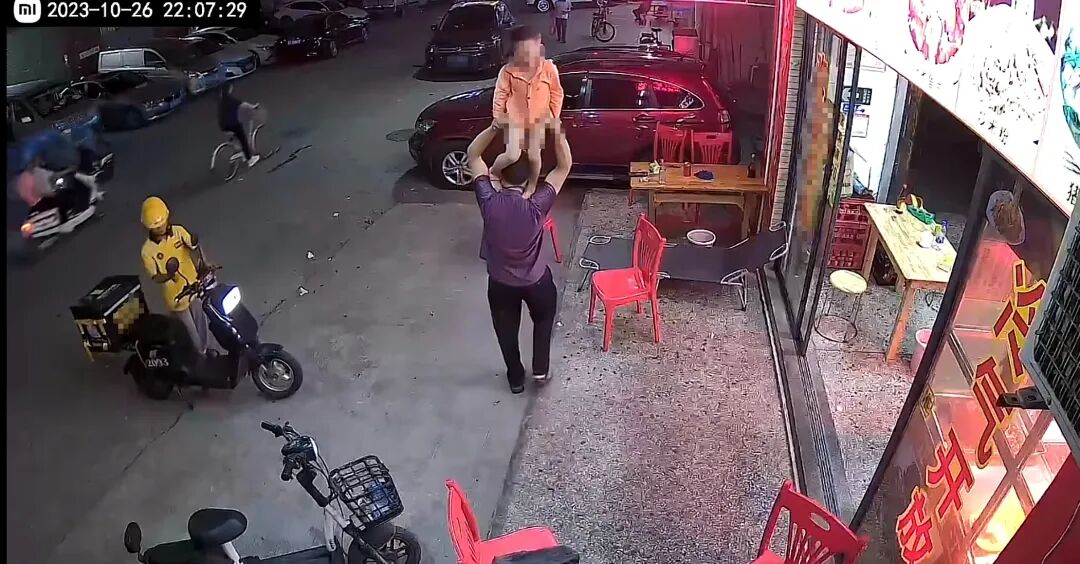 记者注意到,监控画面显示,事情发生在2023年10月26日22点07分,在一家餐馆门口,一名父亲将儿子反向举过头顶,儿子双脚踩在父亲肩膀上。不料没走几步,意外发生了,儿子从父亲肩头摔下,头砸到了地上。父亲迅速将儿子拦腰抱起,口中呼喊着“儿子、儿子”,而儿子则用手捂着头。