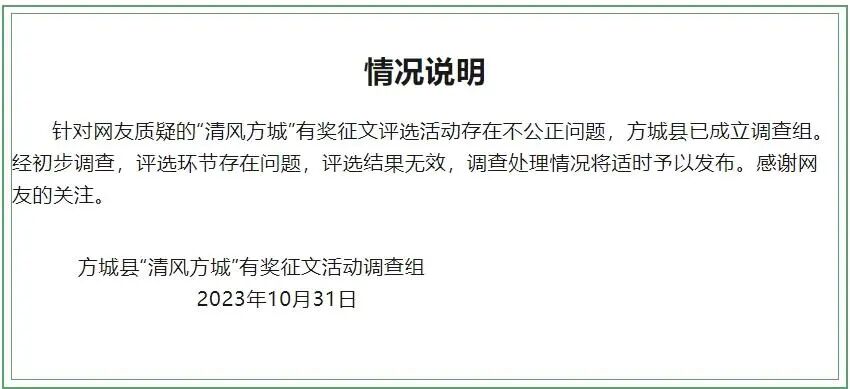 针对网友质疑的“清风方城”有奖征文评选活动存在不公正问题,河南南阳市方城县“清风方城”有奖征文活动调查组10月31日凌晨发布情况说明称,经初步调查,评选环节存在问题,评选结果无效,调查处理情况将适时予以发布。