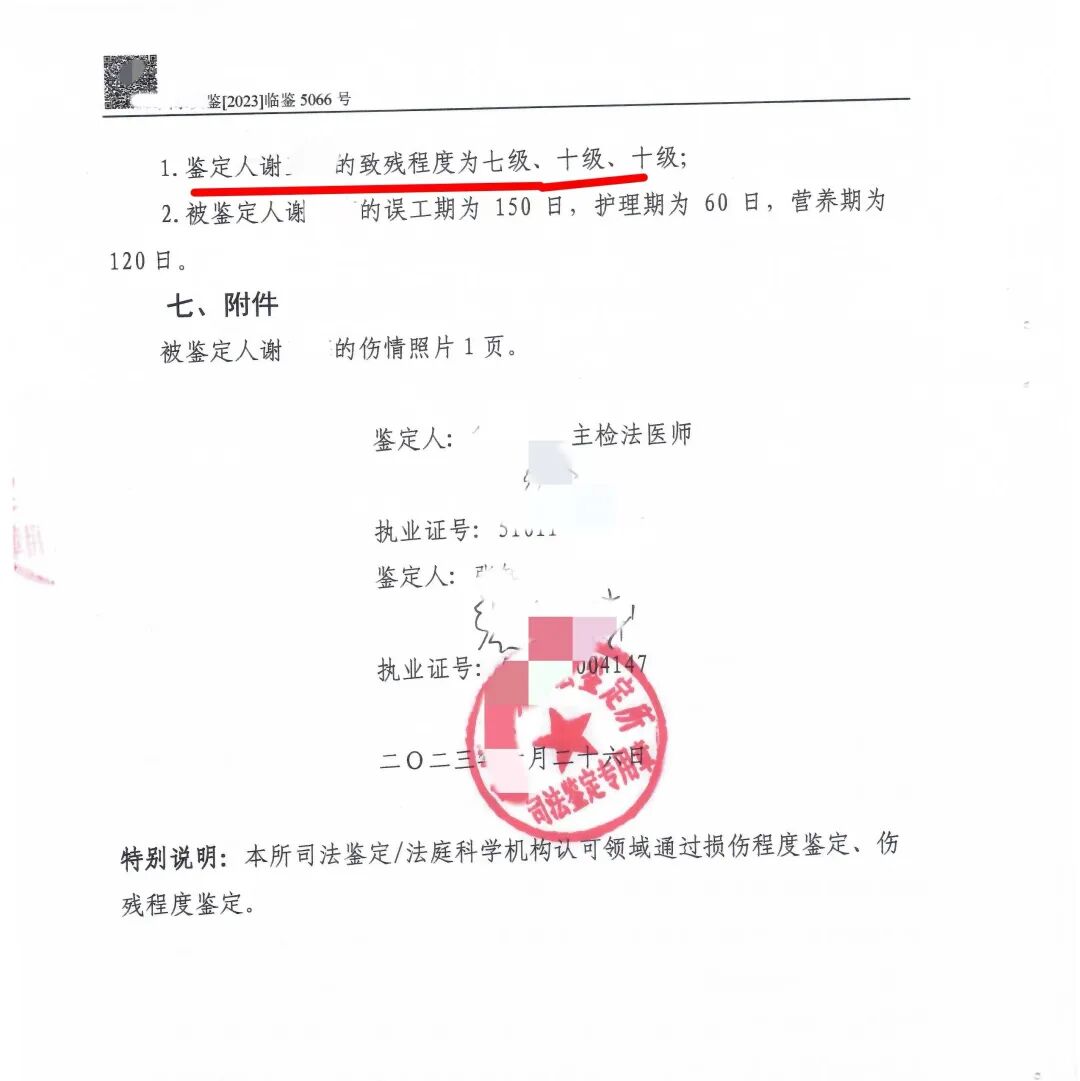 11月1日,谢女士告诉记者,她的伤残鉴定结果出来了,被鉴定为伤残七级。目前,案件仍在侦查中。