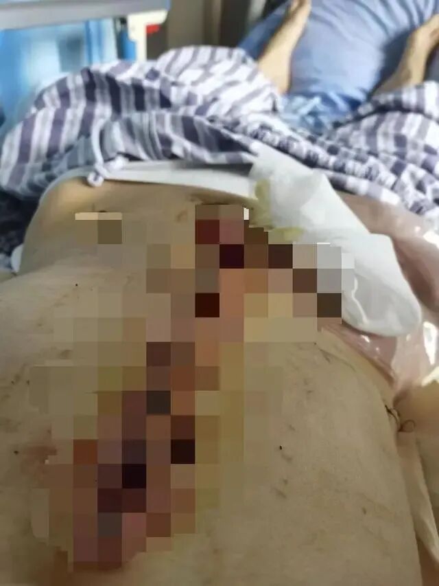 一张躺在病床上的照片,肚子上一道纵向的长长的缝合伤,身上插着各种管子,四川成都的谢女士称,这是她进行抢救后的样子。