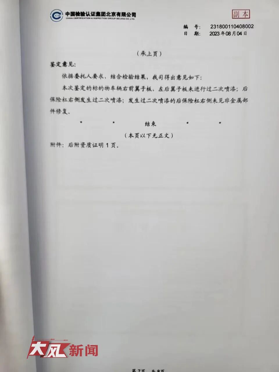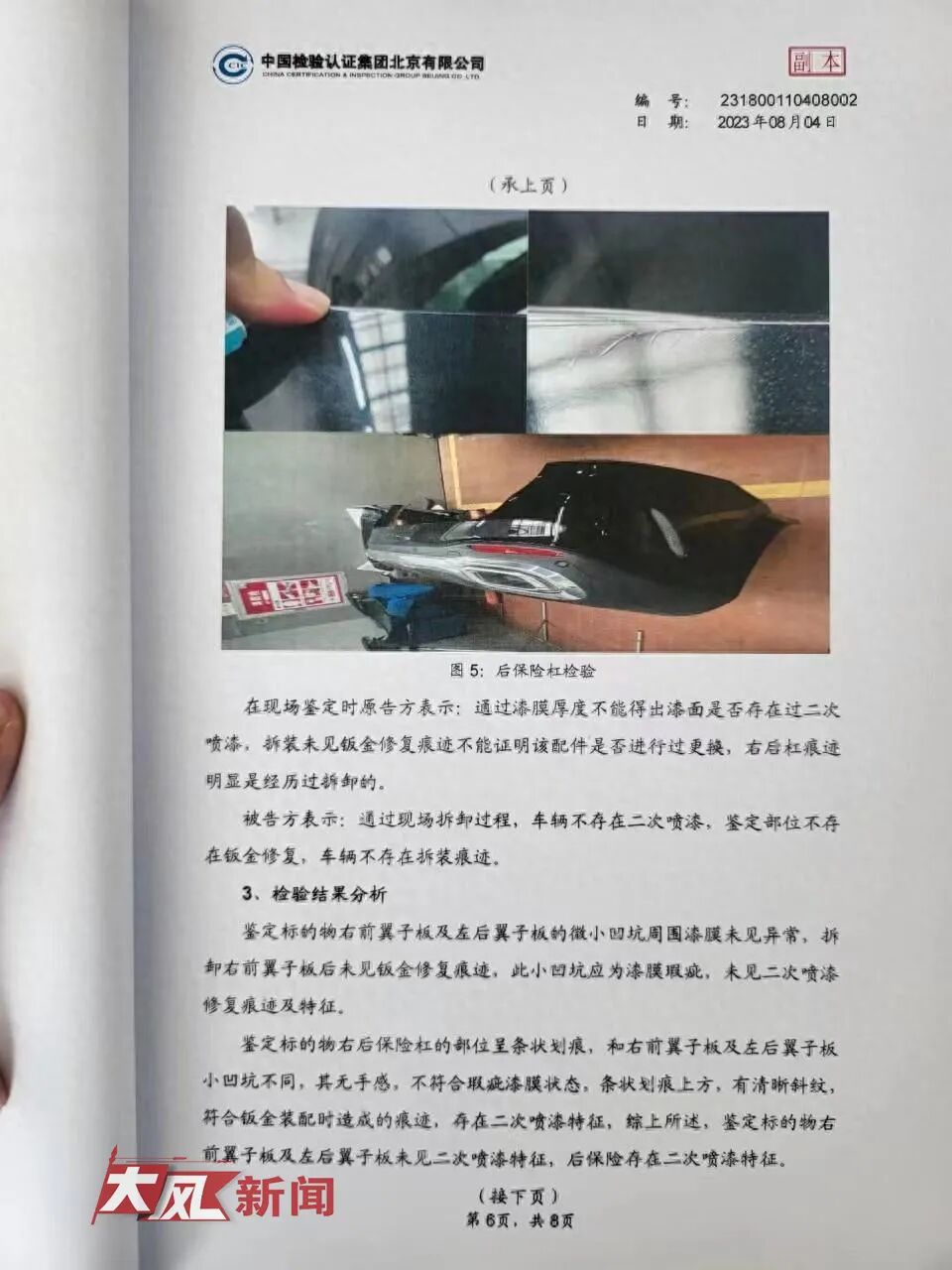 法院委托中国检验认证集团北京有限公司进行鉴定,2023年8月4日,该鉴定机构作出《鉴定意见书》。鉴定认为:车辆右前翼子板、左后翼子板未进行过二次喷漆;后保险杠右侧发生过二次喷漆;发生过二次喷漆的后保险杠右侧未见非金属部件修复。
