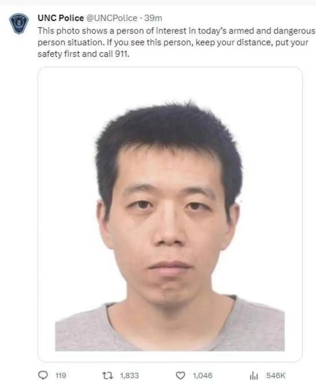 当地时间8月28日,美国北卡罗来纳大学教堂山分校(UNC)考迪尔实验室发生一起枪击事件,犯罪嫌疑人是来自中国的物理系博士生齐某磊。