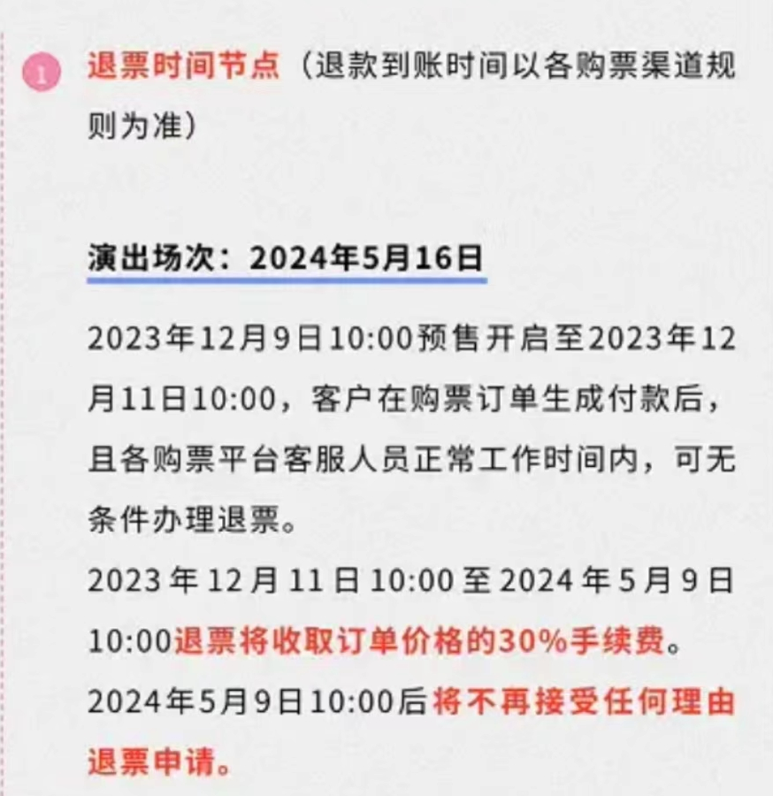 2023年12月11日10点至2024年5月9日10点退票,将收取订单价格30%手续费;