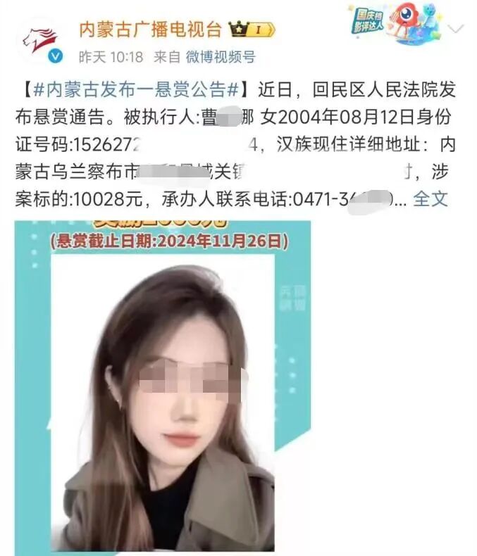 近日,呼和浩特市回民区人民法院发布悬赏公告,寻找被执行人曹某娜。曹某娜出生于2004年,涉案标的为10028元。悬赏公告中,年仅19岁的被执行人曹某娜照片容貌清秀,被网民戏称为“高颜值女老赖”。